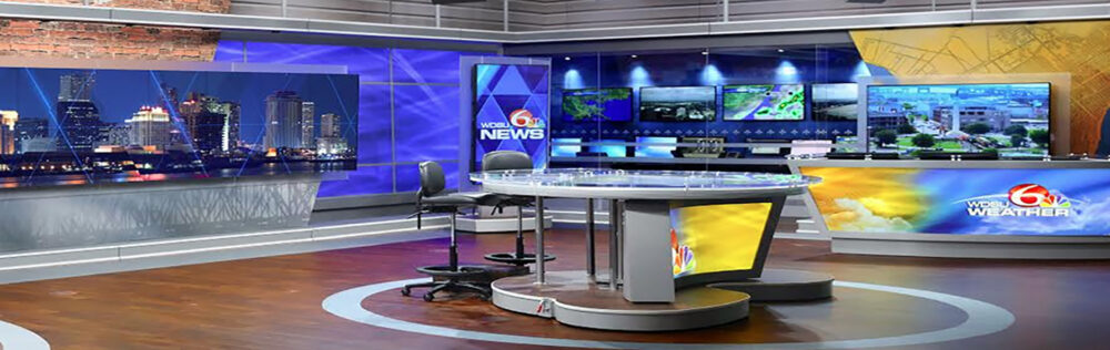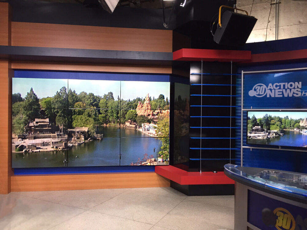The main anchor area boasts three LED arrays with a large storytelling wall positioned on the right, created from fourteen monitors configured in a 7×2 array The set’s weather area includes a 4×2 vertical video wall along with a moveable weather pod.
