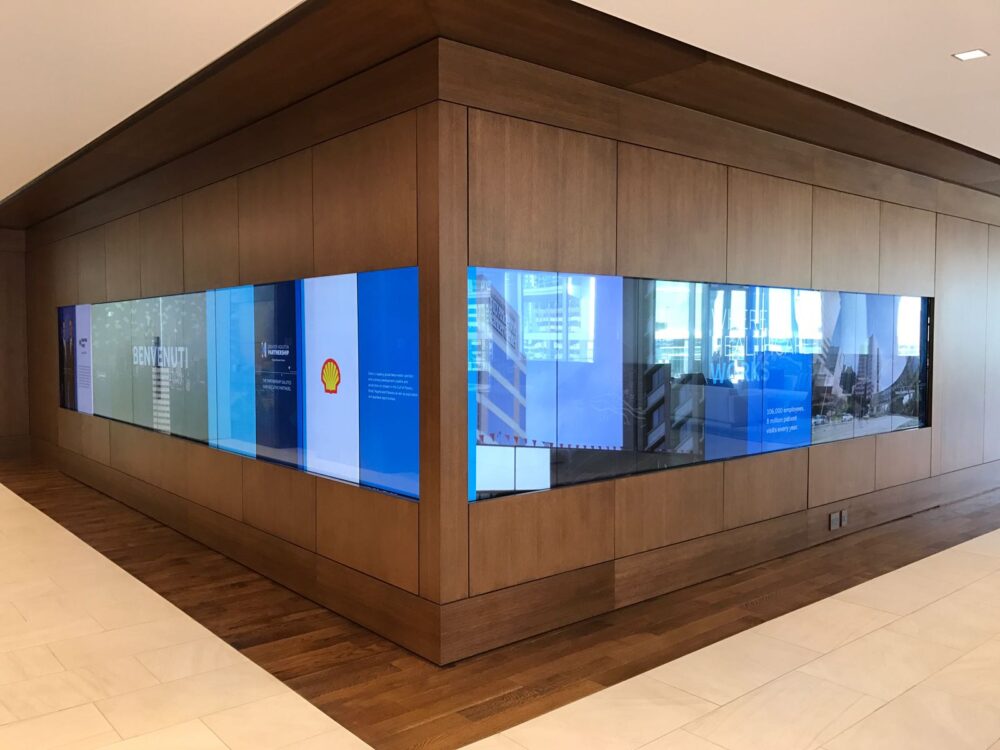 Placed on a diagonal in this space is a freestanding 2×2 flat screen array from Primeview flanked by frosted panels on both the sides and above.