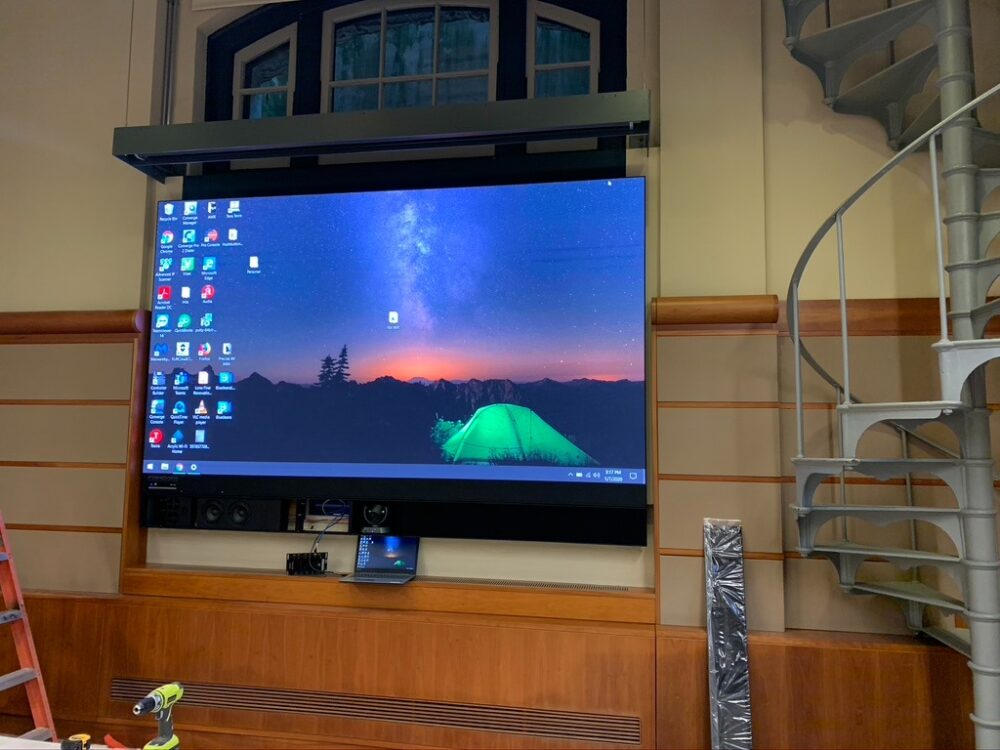 In the newly renovated auditorium, a dual 165” FusionMAX video wall setup from Primeview was designed and installed by Sound Concepts.