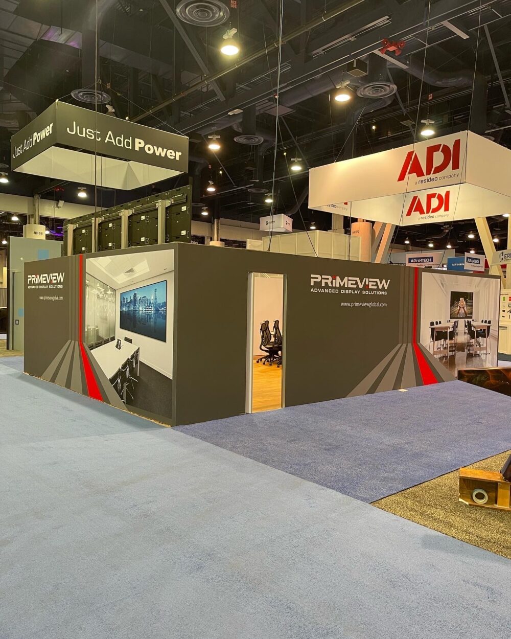The lifestyle set has three, 75” monitors which allow for easy branding and topical graphic insertion. All of the set’s technology was provided by Primeview.